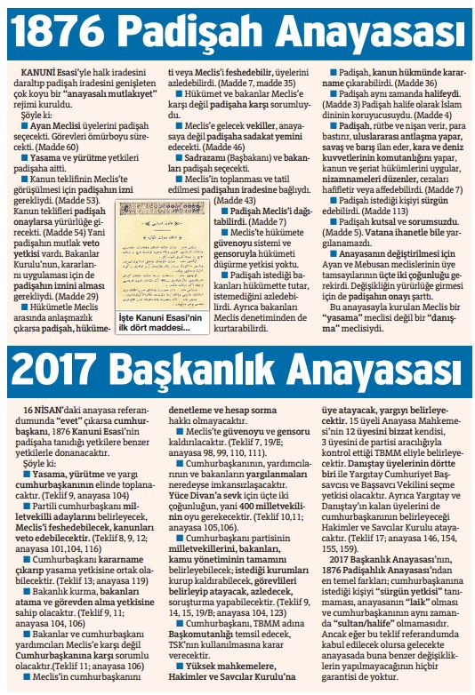 1876 Padi$ahlik anayasasi 2017Ba$kanlik anayasasi cumhuriyetten meşrutiyete dönülmektedir ,kiyaslayin okuyun,i hepiniz okuma yazma biliyorsunuz aradaki farki ayirt edebilecek zekada insanlarsiniz..YOBAZ TAYFASI haric tabi |